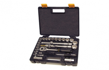 Vasos superlock de 19 x 6 pts de 8 a 32mm, 1 junta universal, 2 barras de extensión 5 "y 10", 4 barras de extensión de 2 ", 2 llaves de bujías de 16 mm + 21 mm, 1 adaptador de 3 vías, porta puntas de 1/4 ", 1 mango giratorio, 18 puntas de 1/4 "x 25: hex.