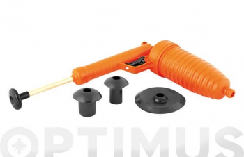 El desatascador funciona mediante aire comprimido previamente cargado con elémbolo incorporado en el mango.