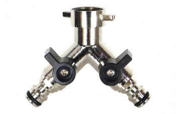 Permite la conexión de dos mangueras de riego,con llave de paso para uso independiente.