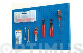 Fabricado en metal perforado acabado en azul.